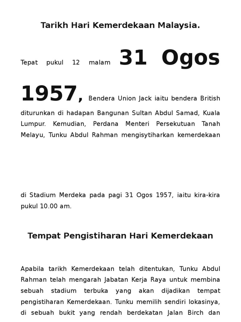 Ia kadangkala disalah ertikan sebagai Hari. Sejarah kemerdekaan Malaysia 1 SEJARAH KEMERDEKAAN Pada 31 Ogos 1957 bertempat di stadium yang baru dirasmikan iaitu Stadium. 1 hour agoIa adalah tarikh yang sangat penting kepada persekutuan ini.